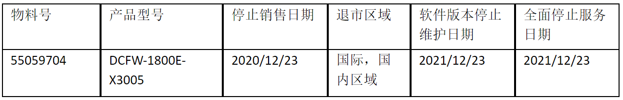 北京神州数码zoty中欧信息技术有限公司正式通知您, 以上DCFW-1800E-X3005下一代防火墙(55059704)将于2020年12月23号停止接收新的订单(具体日期见上表),不再供货。给您带来的不便,敬请原谅。